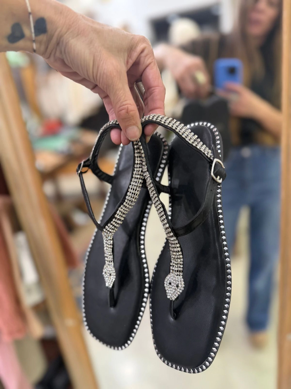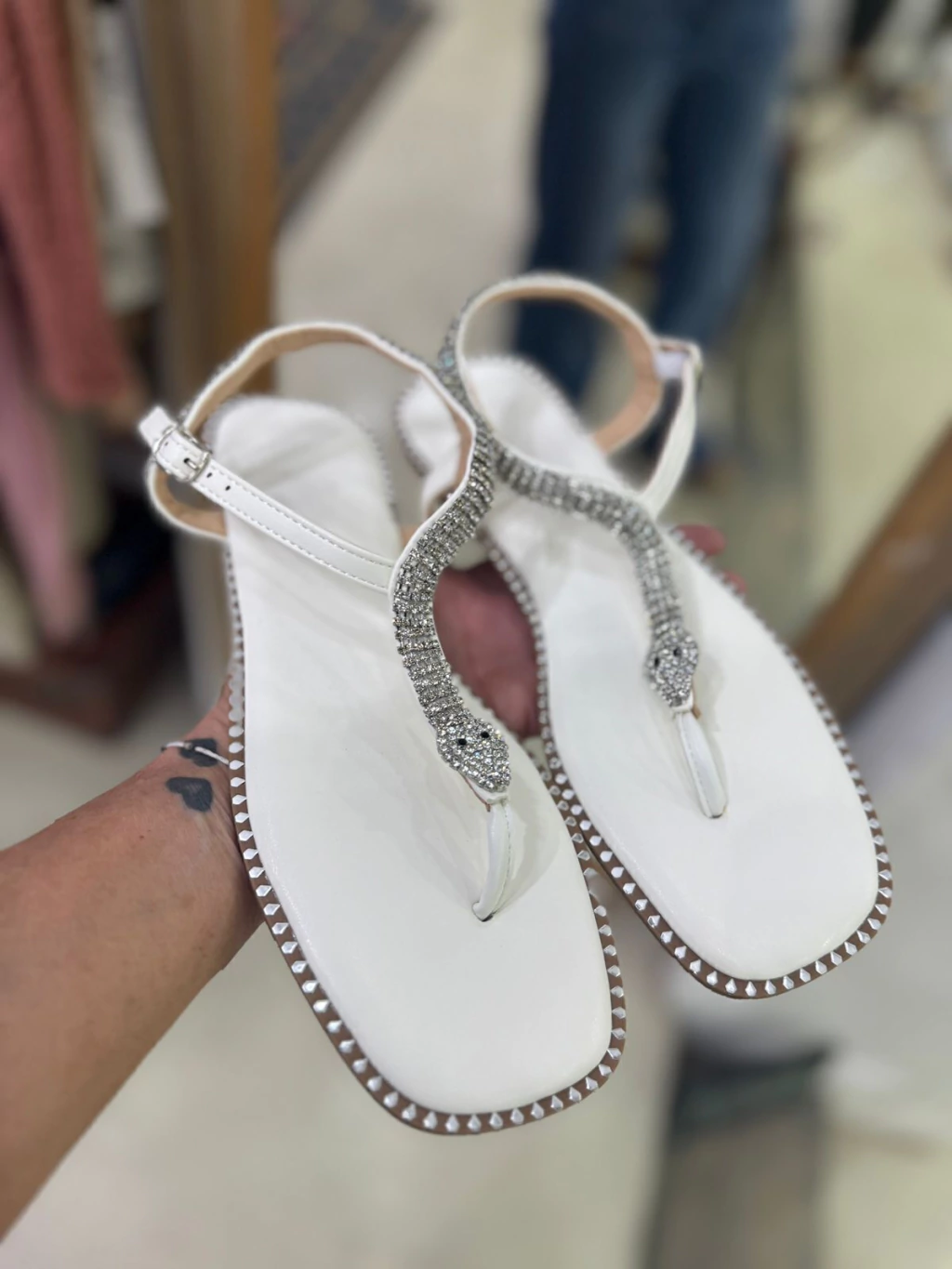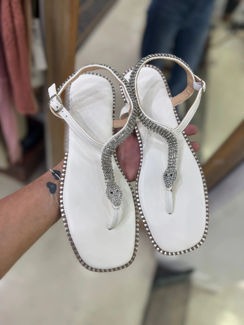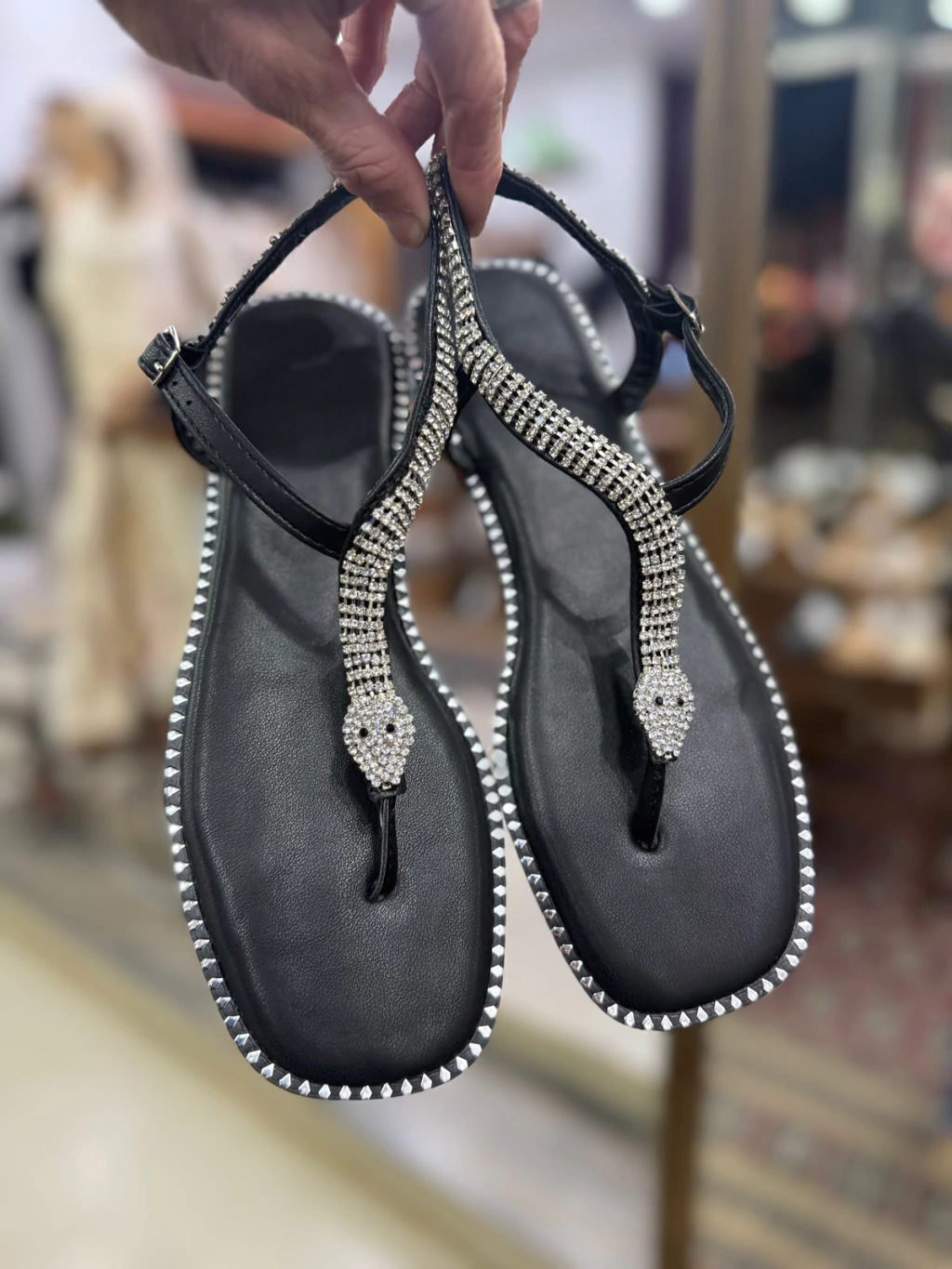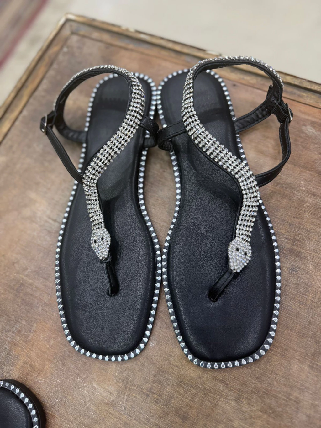 Ojotas Chatas veganas con detalle de serpiente con strass. Base de goma flexible.